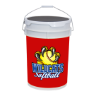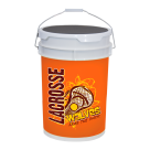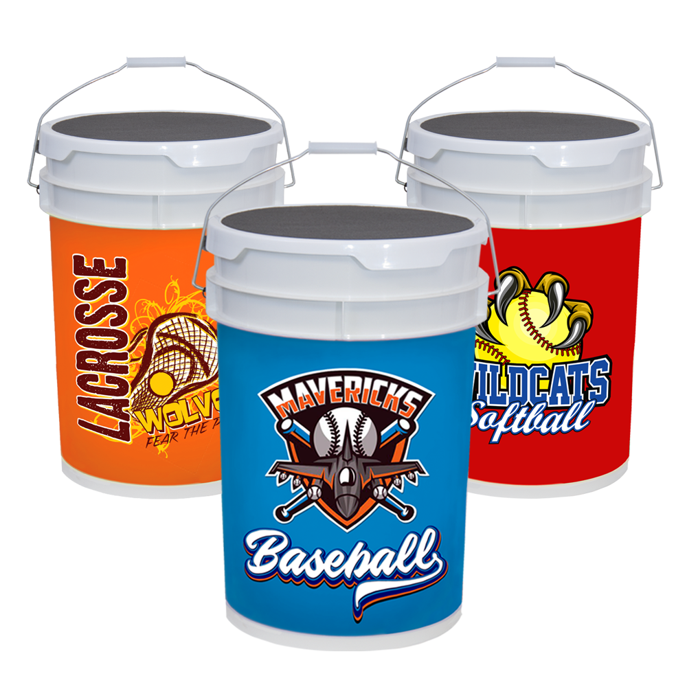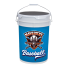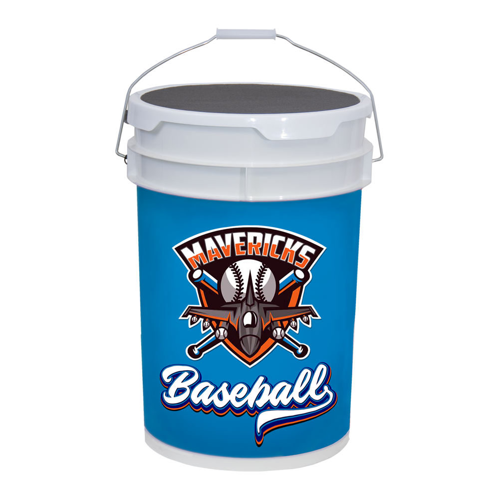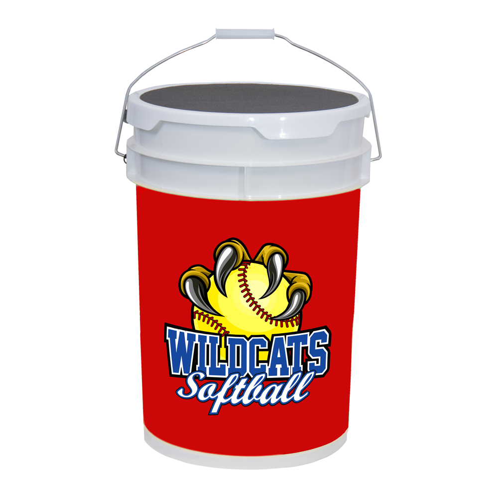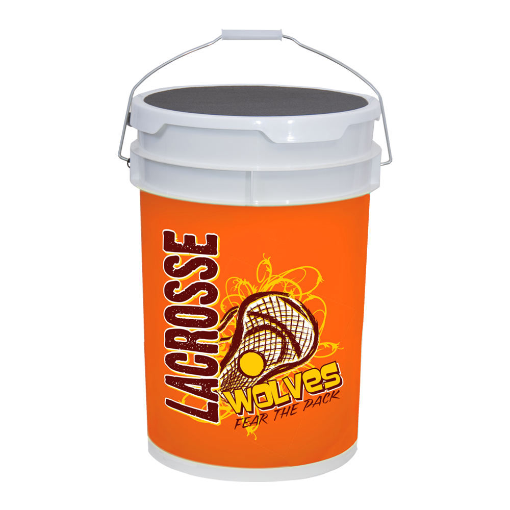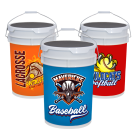 Heavy-duty 6-gallon ball bucket with padded lid for a comfortable seat between drills. Holds about four dozen baseballs, two dozen softballs, or eight dozen lacrosse balls—built tough with a metal handle for easy carry.