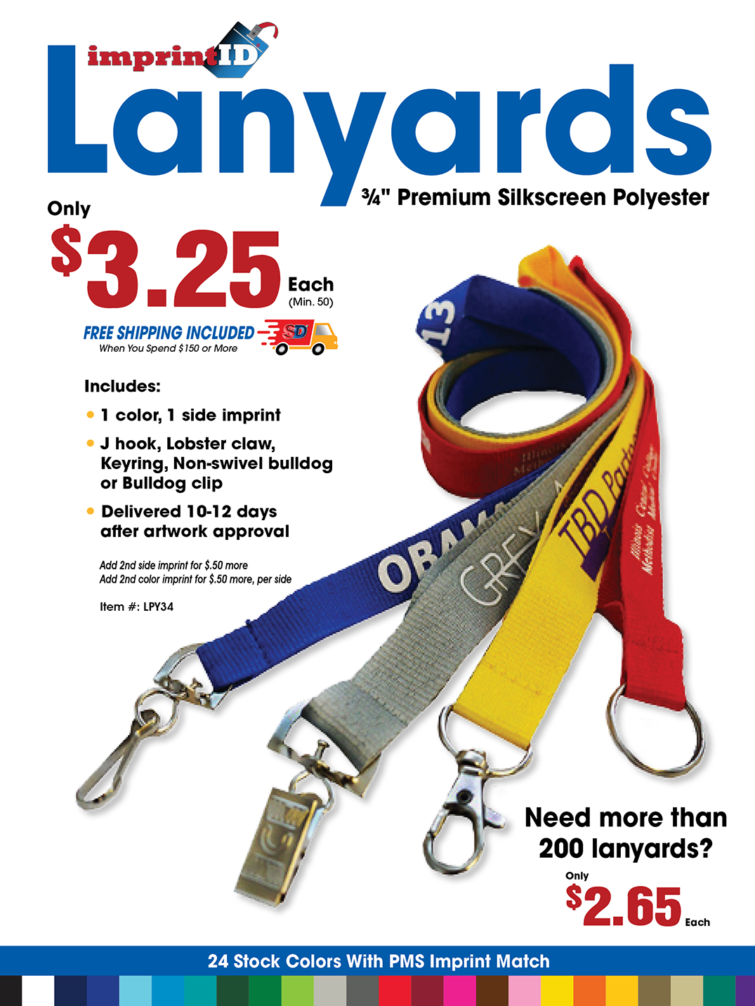 Only $3.25 each (min. 50). Each lanyard includes a 1-color, 1-side imprint and your choice of hardware: J-hook, lobster claw, keyring, non-swivel bulldog clip, or swivel bulldog clip. Available in 24 stock colors with PMS color matching, these durable silkscreen lanyards are perfect for ID badges, events, classrooms, and team branding. Need more than 200? Save even more at just $2.65 each. Delivered in 10–12 days after artwork approval, with FREE shipping when your order reaches $150 or more.