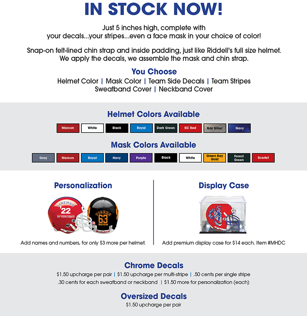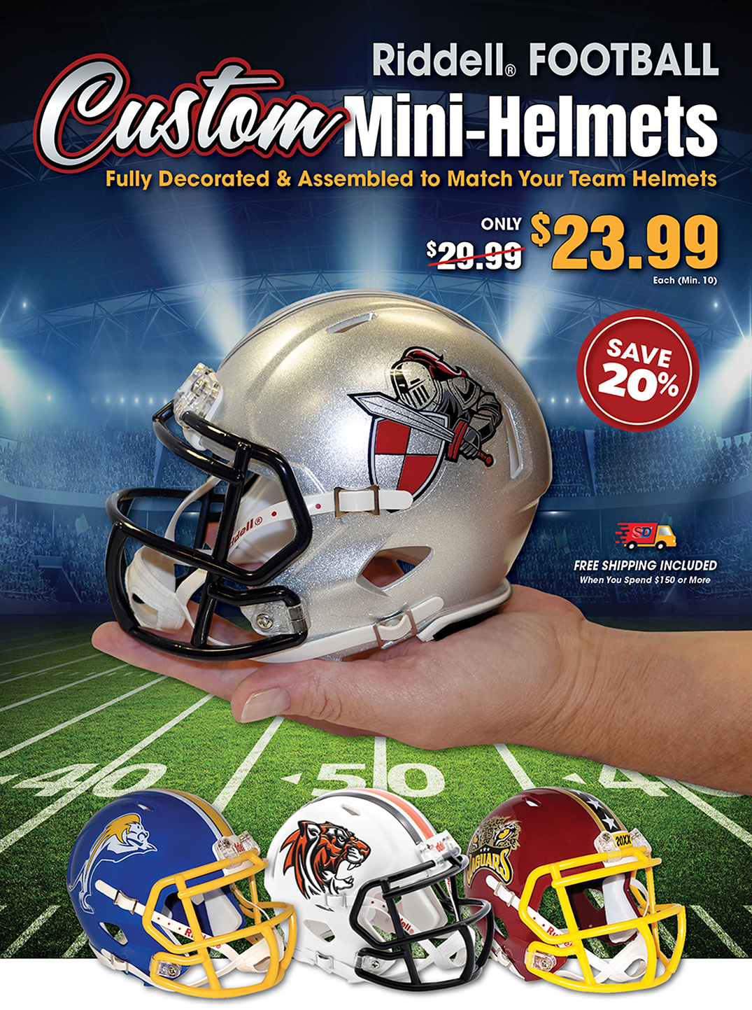 Show off your team pride with fully custom Riddell® Mini-Helmets—now only $23.99 each (minimum 10), a savings of 20%!
