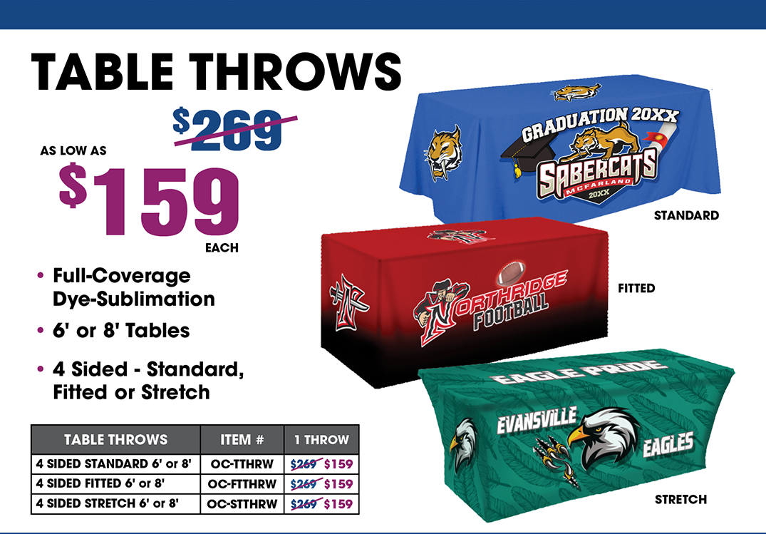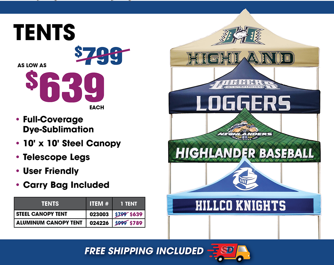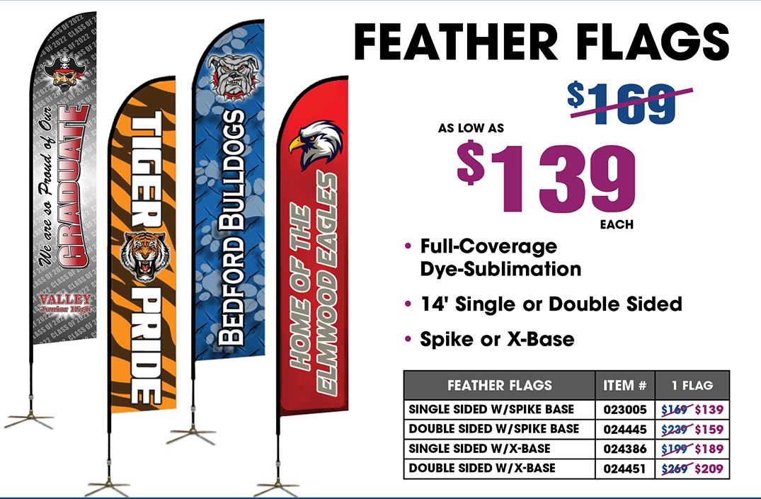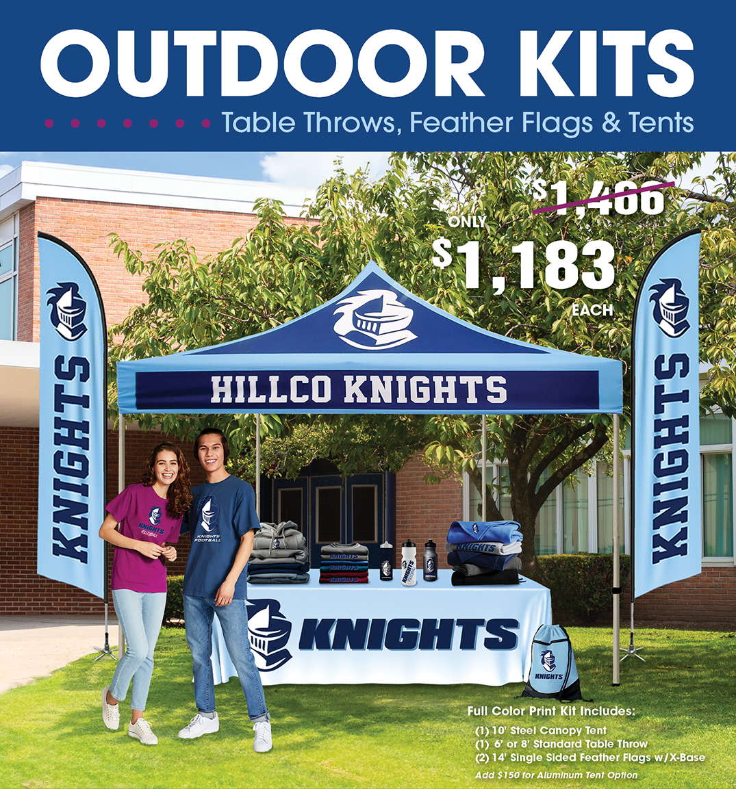 Take your school, team, or event outdoors with custom full-color Outdoor Kits—including table throws, feather flags, and tents—now available at major savings. Dye-sublimated table throws start at just $159, 14' feather flags as low as $139, and premium 10' x 10' canopy tents from only $639. Each piece delivers vivid, edge-to-edge printing and professional-grade durability, perfect for games, fundraisers, open houses, community events, and sideline setups. Choose single- or double-sided flags, stretch or fitted table throws, and steel or aluminum canopy frames. Free shipping when your order reaches $150 or more. Make your presence impossible to miss!