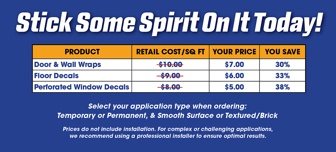 Choose custom wallcals, door and window wraps, or durable indoor/outdoor floorcals—perfect for locker rooms, entrances, weight rooms, cafeterias, and athletic facilities. With vivid full-coverage printing and options for smooth, textured, temporary, or permanent applications, your team branding has never looked better. Save up to 38% with pricing as low as $5–$7 per sq. ft., and enjoy FREE shipping when your order reaches $150. Bring your facility to life and stick some spirit on it today!