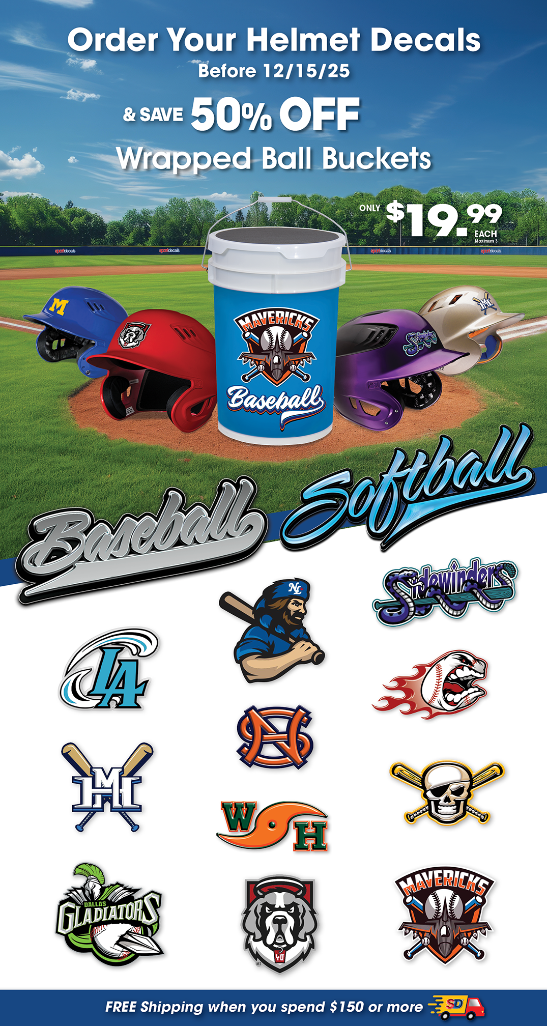 Order by 1/31/26 and score 50% OFF wrapped ball buckets for only $19.99 each (limit 3). Choose from bold team graphics or create a custom look that stands out on the diamond. Perfect for outfitting players, updating your program’s branding, or adding spirit to your dugout gear. Plus, enjoy FREE shipping when your order hits $150 or more. A great way to save while gearing up for spring ball.