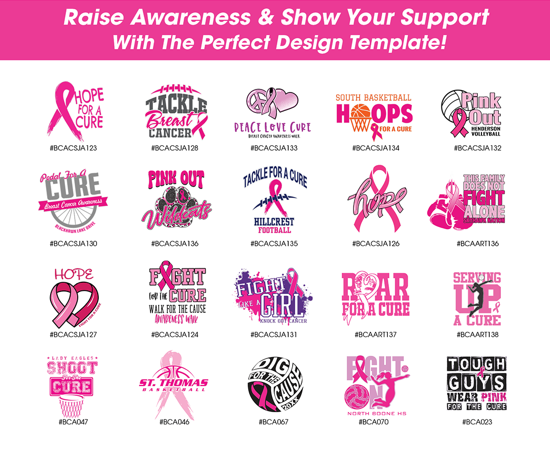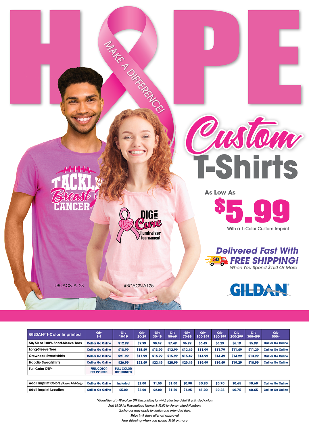 Starting as low as $5.99 with a 1-color imprint. Choose from dozens of inspiring breast cancer awareness designs or personalize your own for teams, schools, fundraisers, and community events. Available in Gildan® tees, long sleeves, hoodies, and sweatshirts, with fast turnaround and optional full-color DTF printing for bold, vibrant detail. Ships in as little as 5 days after art approval, and you’ll get FREE shipping when your order reaches $150. Perfect for Pink-Out games, charity walks, tournaments, and cause-driven apparel sales.
