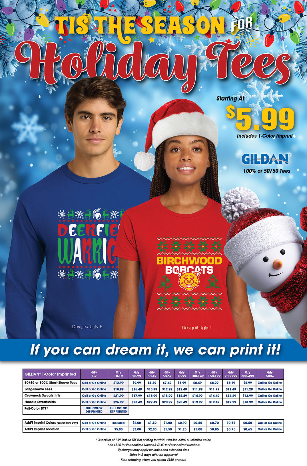 Celebrate the season in style with custom Holiday Tees starting at just $5.99, including a 1-color imprint. Choose from popular Gildan short-sleeve tees, long sleeves, sweatshirts, or hoodies—and customize them with your team name, mascot, or one of our festive holiday designs. Add extra imprint colors, names, or numbers, and enjoy ultra-fine detail with optional full-color DTF printing. Orders ship in as little as 5 days after art approval, and you’ll get free shipping when your order reaches $150. Perfect for spiritwear, holiday events, fundraisers, and school merch that spreads cheer.